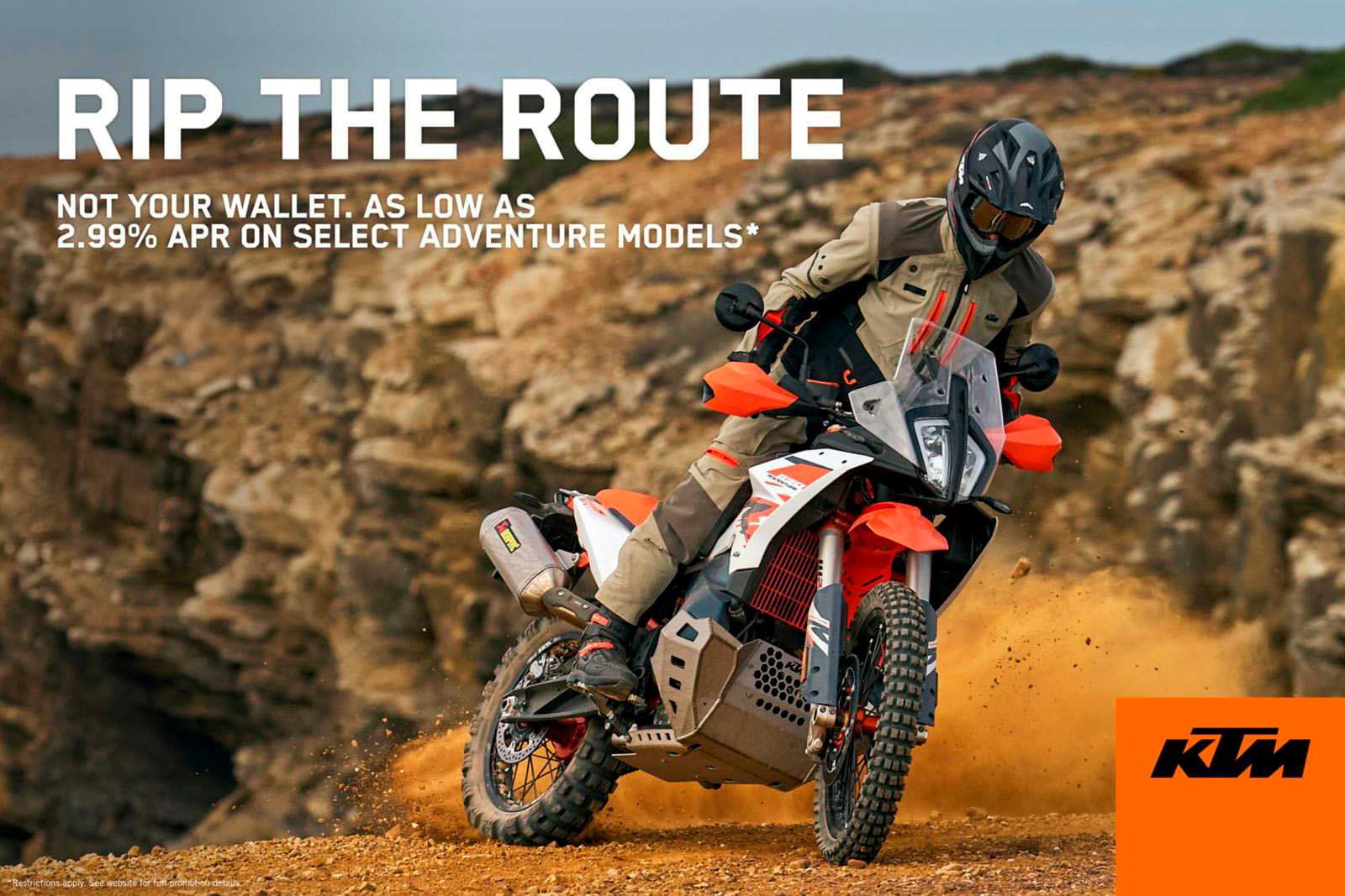 *Terms and Conditions: As low as 4.99% APR for up to 60 months on select new, untitled and unregistered 2025, 2024 and 2023 KTM offroad (2024: KTM SX-E 3, 5; 50, 50 FACTORY EDITION, 65, 85 SX (17/14 & 19/16), 125, 250 SX; 250, 350, 450 SX-F; 125, 250, 300 XC; 250, 350, 450 XC-F; 150, 250, 300 XC-W; 450 XCF-W; 350, 500 XW-F; 350, 500 EXC-F) and street (2025: KTM 450 SMR; 890 ADVENTURE R / 2024: KTM 450 SMR; RC 390; 250, 390, 790, 990 DUKE; 1390 SUPER DUKE R EVO; 1290 SUPER DUKE GT; 890 SMT; 690 SMC R; 690 ENDURO R; 390, 790 ADVENTURE; 890 ADVENTURE R; 890 ADVENTURE R RALLY; 1290 SUPER ADVENTURE S; 1290 SUPER ADVENTURE R / 2023: KTM 1290 SUPER DUKE GT; 1290 SUPER ADVENTURE S). Valid for select model motorcycles financed between August 4, 2025, through OCTOBER 31, 2025, $2,500 or more, subject to change without notice. “As low as” rate assumes excellent credit history. “As low as” rate assumes excellent credit history. Not all applicants will qualify for the lowest rate. Annual Percentage Rate (APR) of 4.99% will be assigned. Example of monthly payments with no down payment required over a 60-month term at 4.99% rate: $18.87 per $1,000 financed. Rate and down payment based on credit approval criteria. Financing is through retail installment sales contracts offered by the selling KTM dealer. Offer is subject to credit approval by Aqua Finance, Inc. Please see your authorized KTM dealer for all program details.